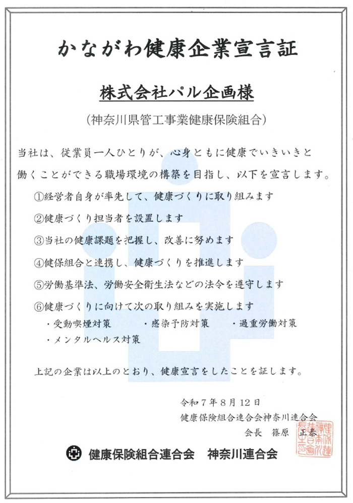 株式会社パル企画は、以下の方針に基づき、健康経営を推進することを宣言します。